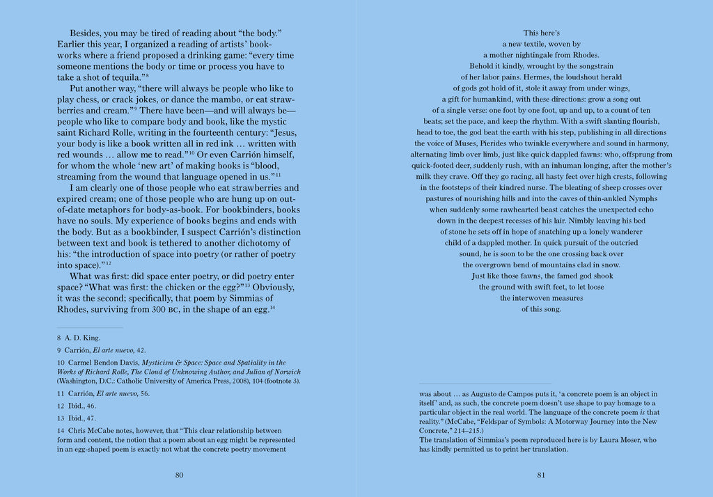 The present republication of SONNET(S) is supplemented by new essays on Carrión’s bookworks by contemporary artists, writers, and scholars from Mexico, Europe, and the US: Felipe Becerra, Verónica Gerber Bicecci (tr. Christina MacSweeney), Mónica de la Torre, Annette Gilbert (tr. Shane Anderson), India Johnson, Michalis Pichler, Heriberto Yépez.